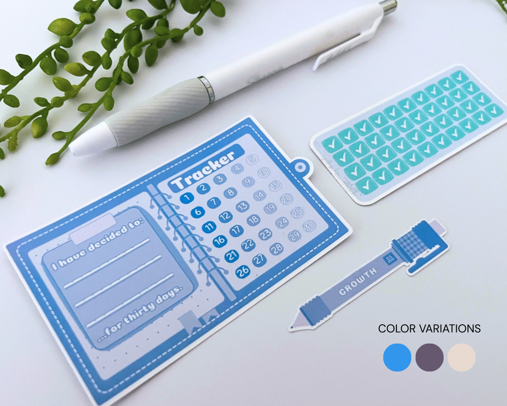 This 30-Day Habit Tracker Sticker Sheet helps you build consistency and stay motivated. Perfect for tracking habits, daily challenges, and self-care routines. Everything including the journal shaped base is a sticker.