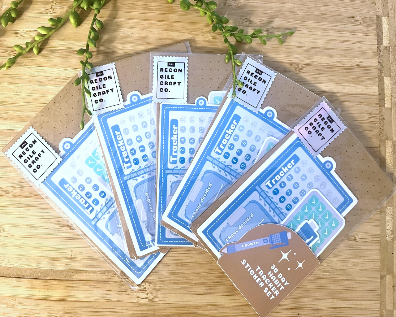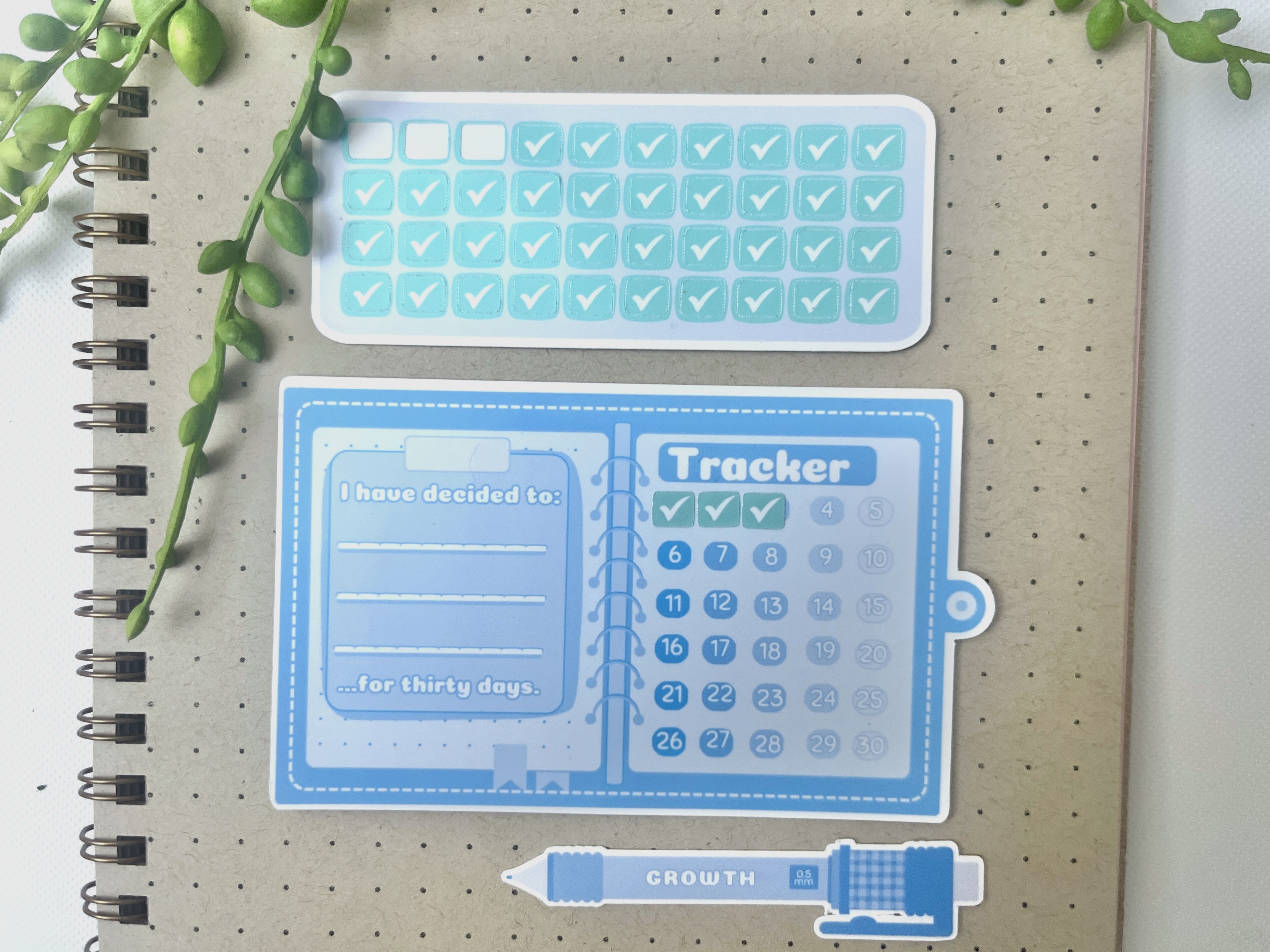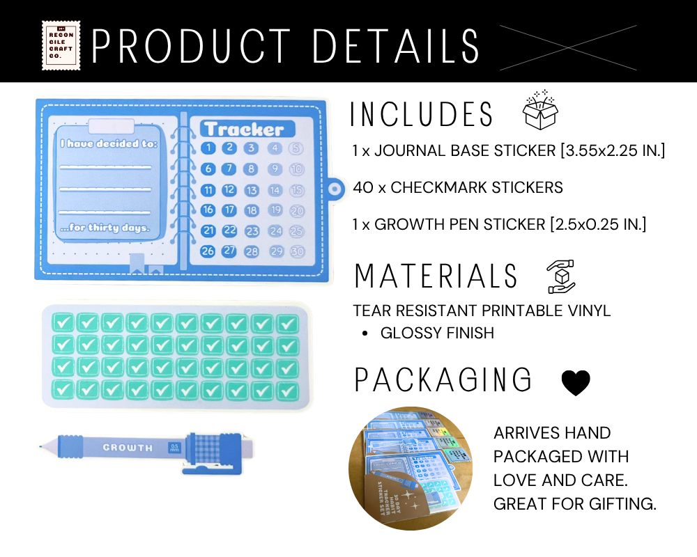 Stay on track with your goals — one sticker at a time!This 30-Day Habit Tracker Sticker Sheet helps you build consistency and stay motivated while adding a pop of charm to your planner or journal. Perfect for tracking habits, daily challenges, and self-care routines. Everything including the journal shaped base is a sticker.