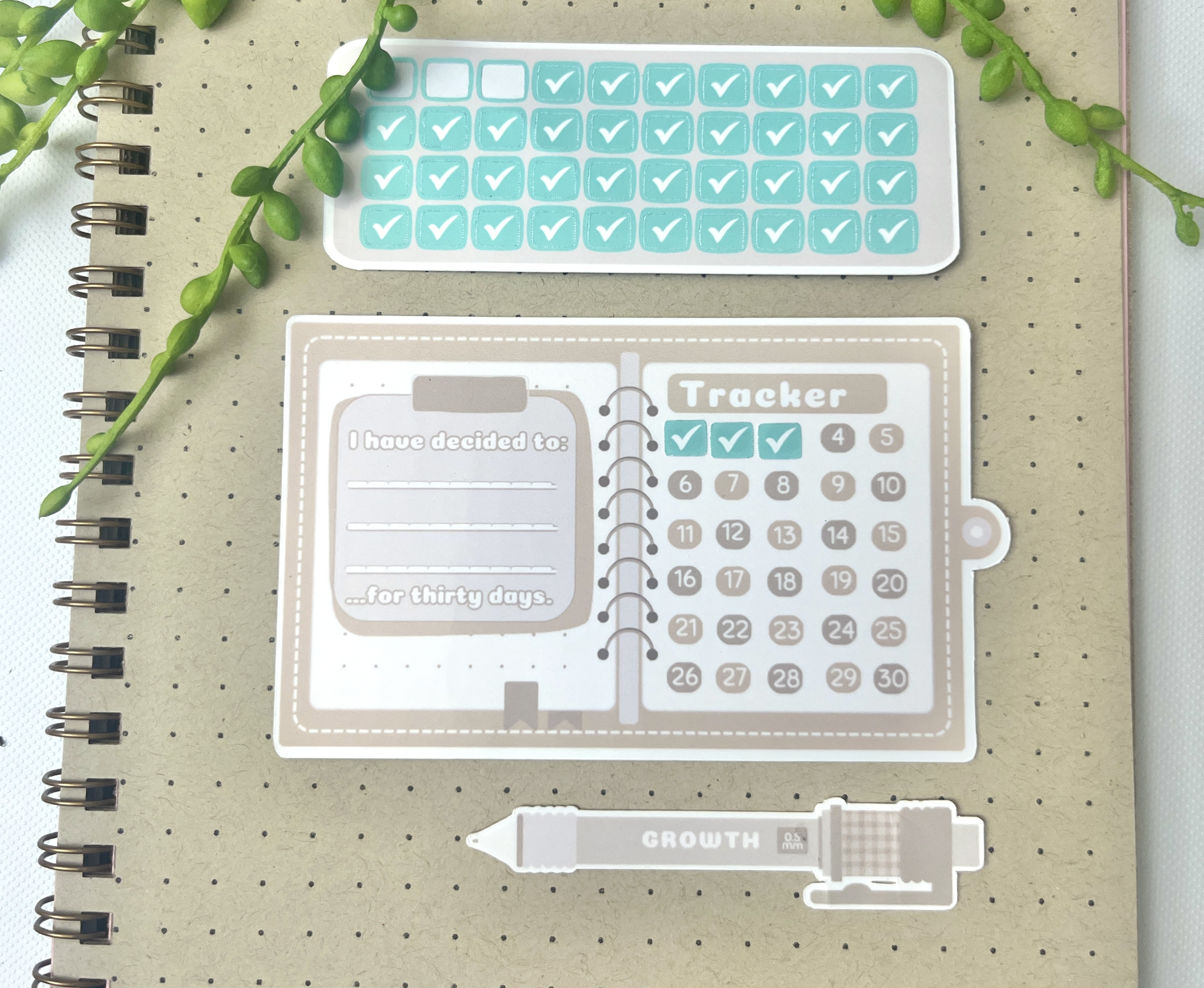 This 30-Day Habit Tracker Sticker Sheet helps you build consistency and stay motivated while adding a pop of charm to your planner or journal. Perfect for tracking habits, daily challenges, and self-care routines. Every part of this kit is a sticker, including the journal shaped backing.