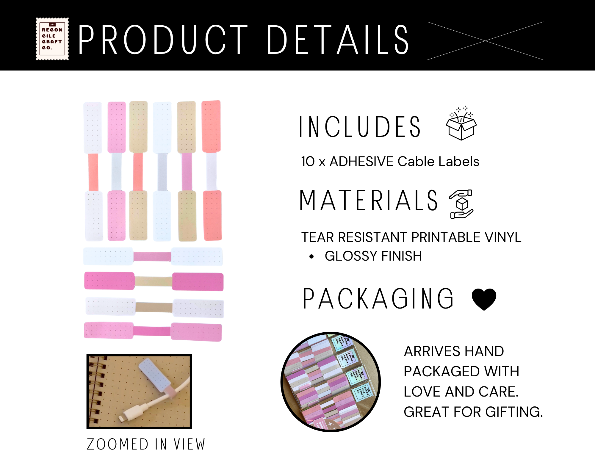 • Set of 10 self-adhesive labels — perfect for chargers, headphones, and craft tools