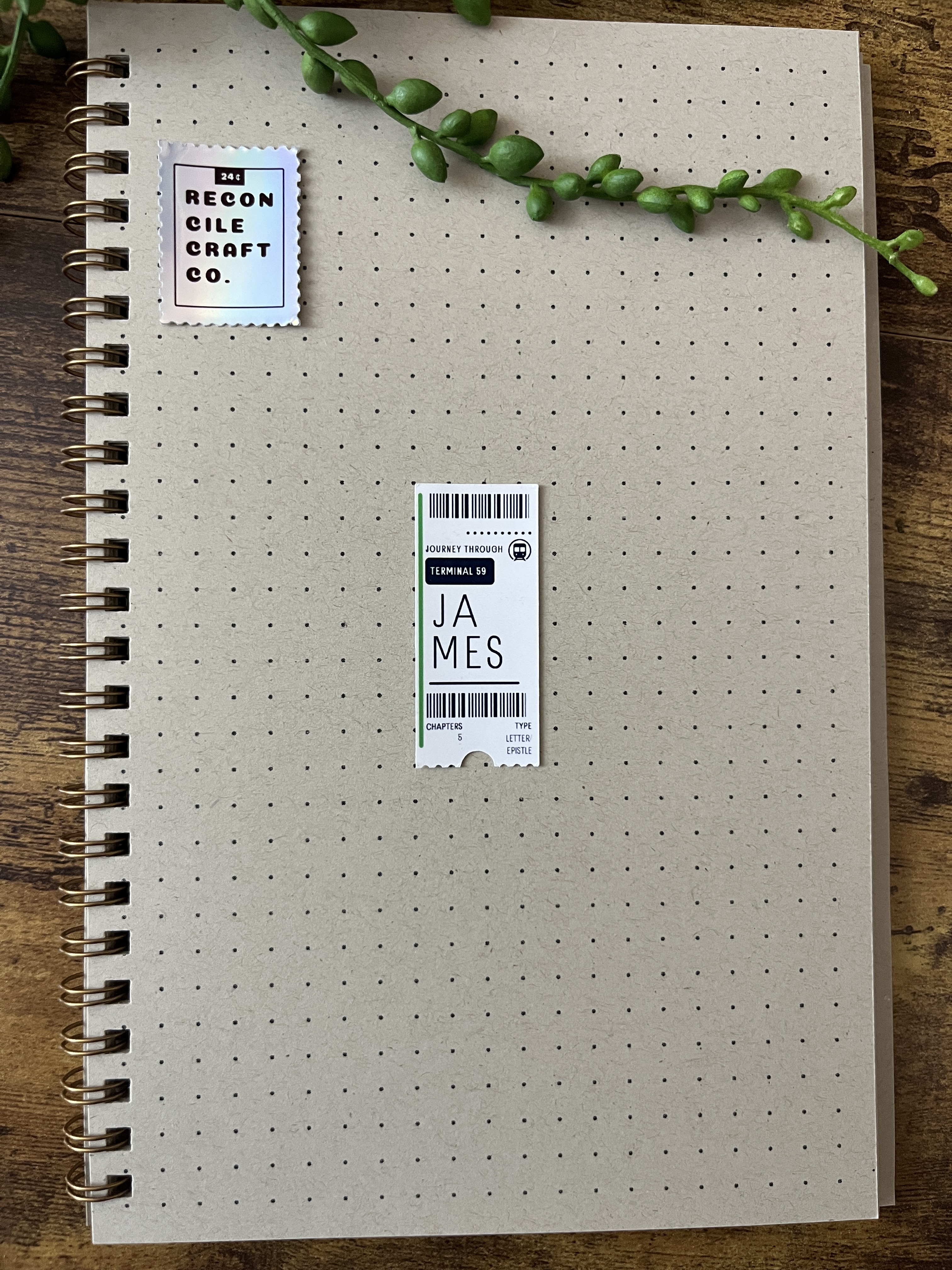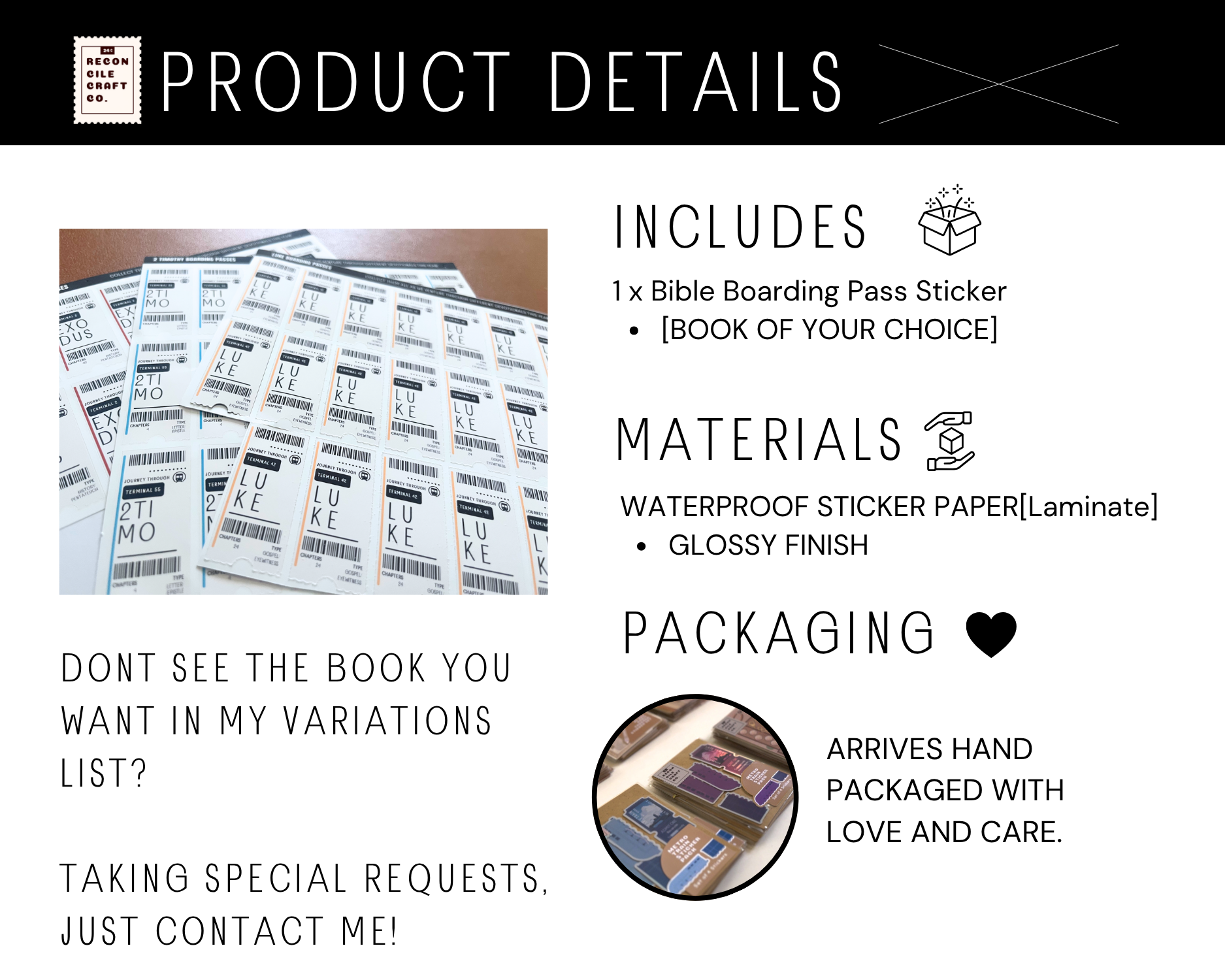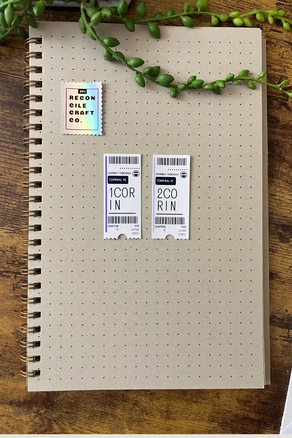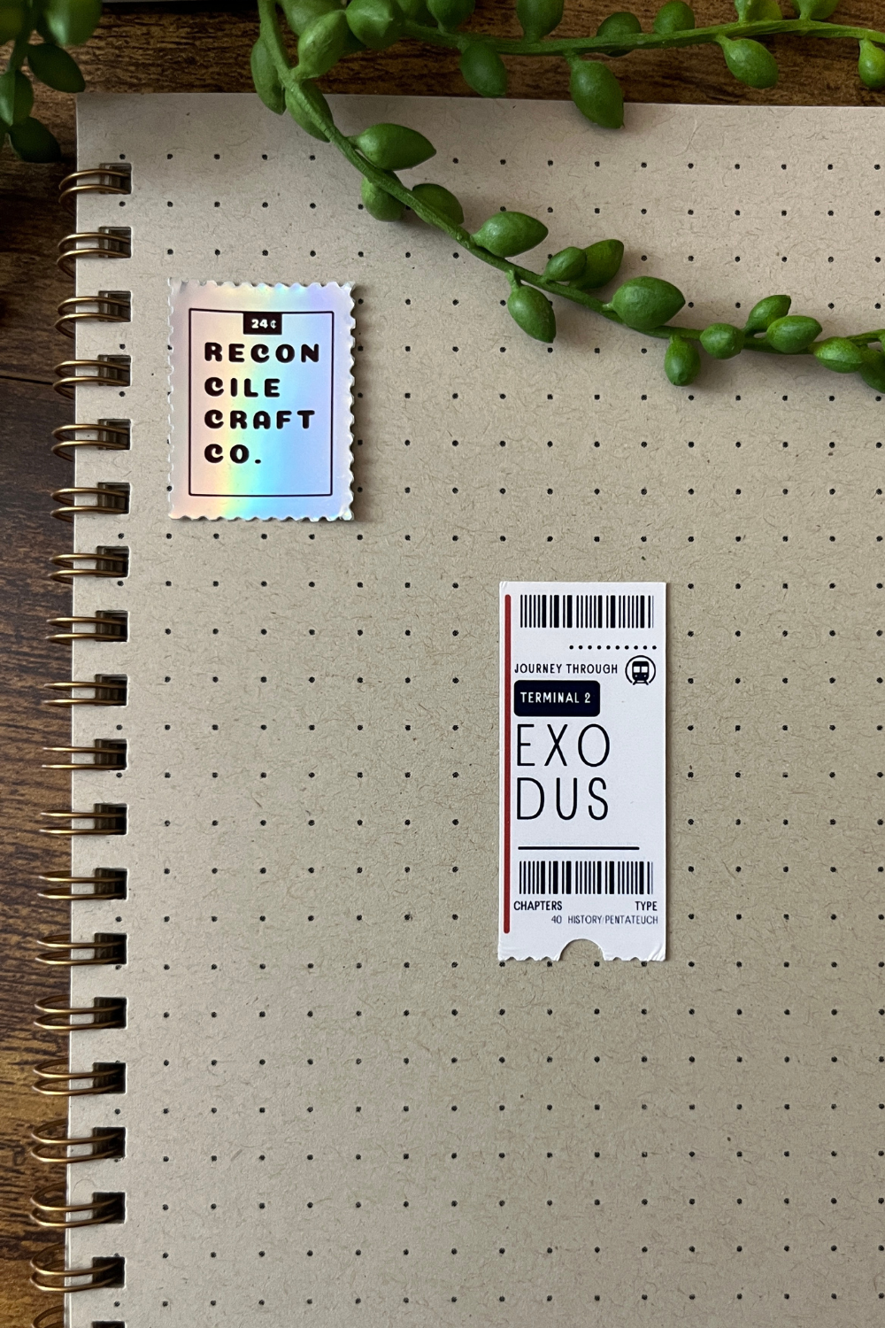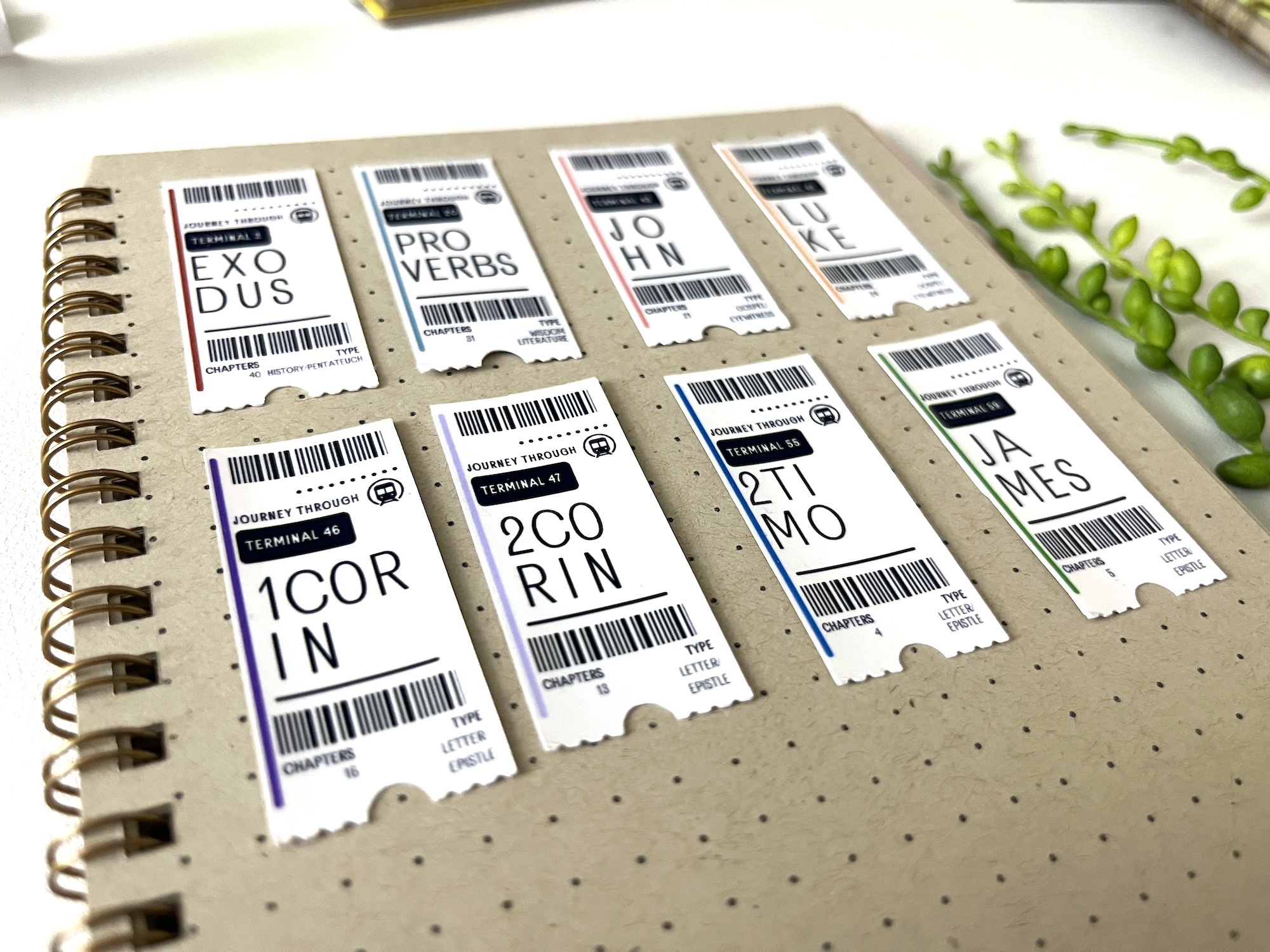 These Christian Stickers are an aesthetic, collectible faith sticker inspired by the look of a vintage boarding pass. Choose your favorite book of the Bible — Luke, James, Exodus, Corinthians, and more — and keep track of your reading journey in a beautiful, tangible way.