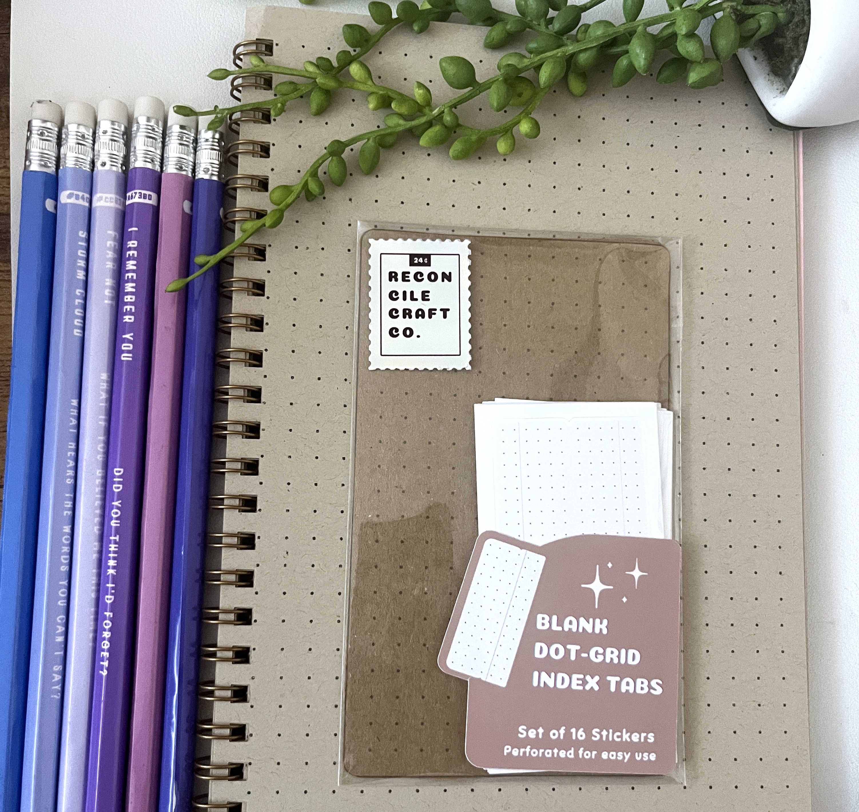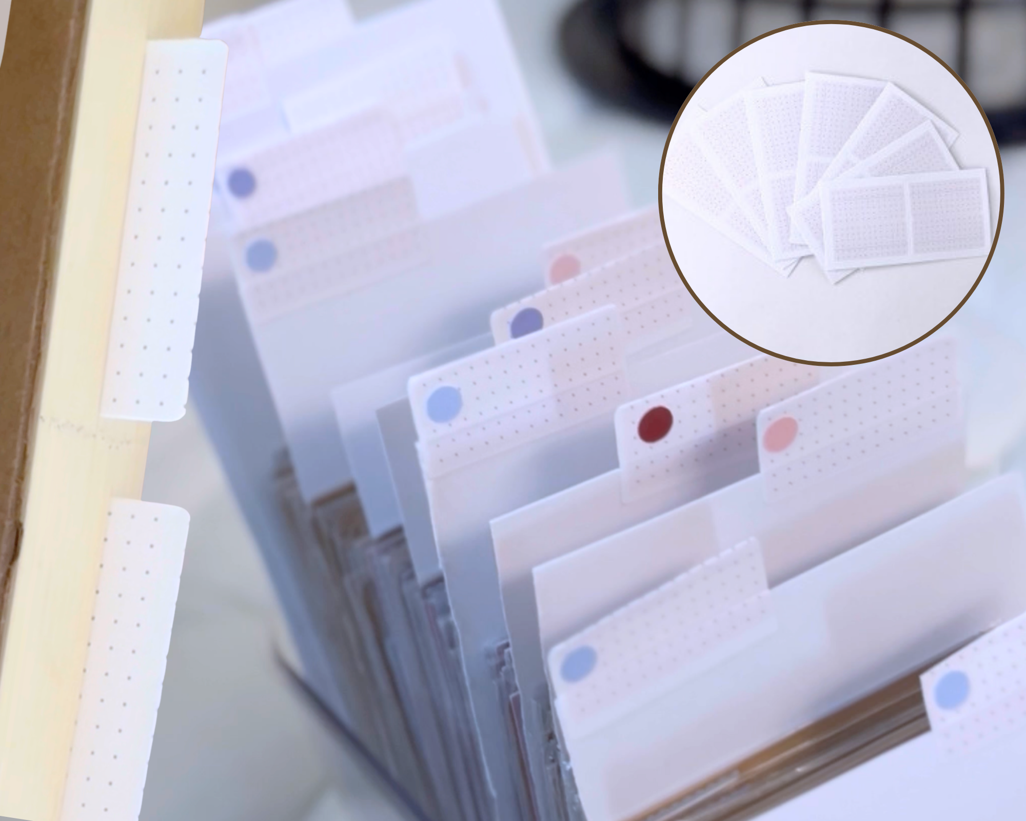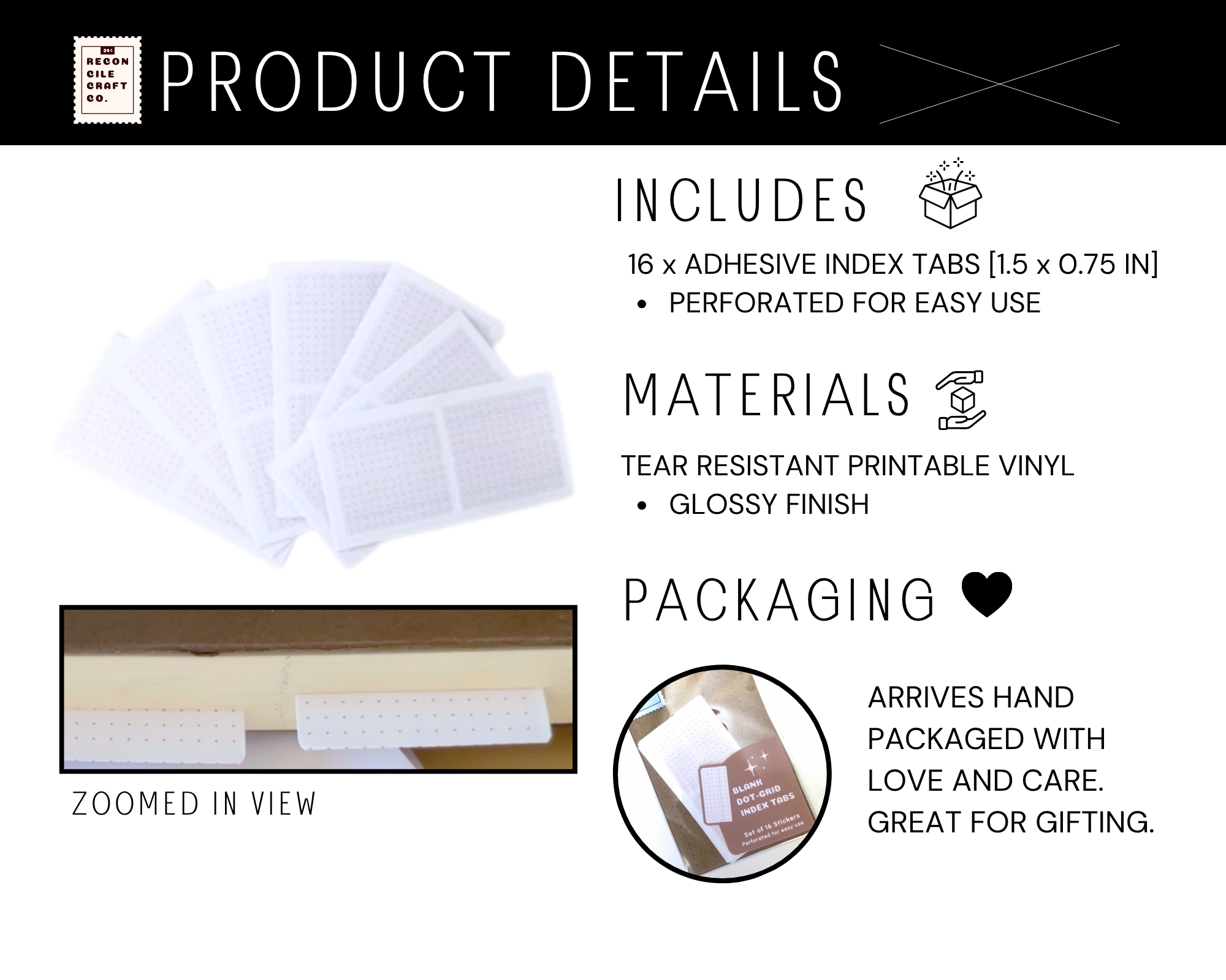 This Set of 16 Blank Dot Grid Index Tabs planners, notebooks, and journals. Made in soft blush-crème tones, these tabs help you stay organized. I use these tabs to organize my sticker dividers for my sticker shop, so I personally test them out. they are awesome. I perfected my cricuts perforation so that you can easily fold them in half.