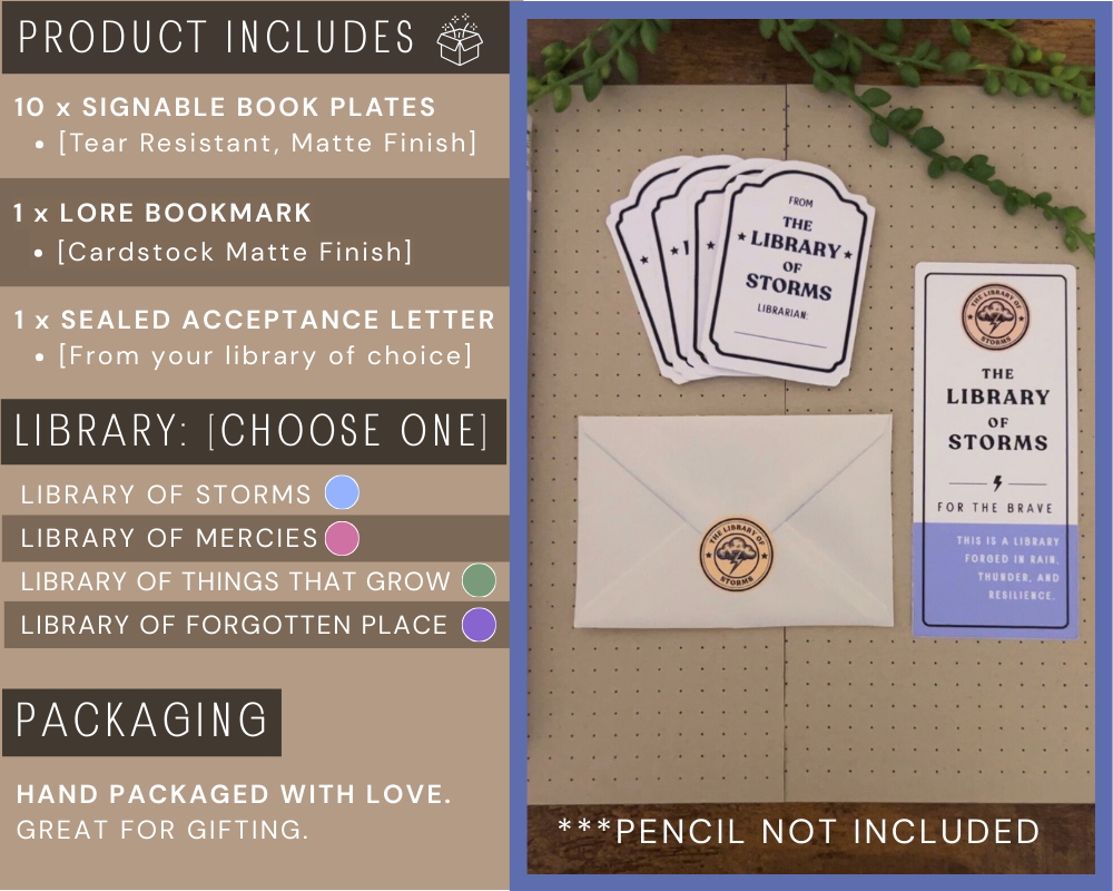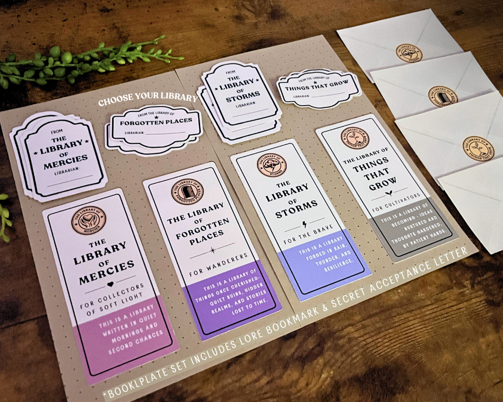 Every bookplate set is printed, cricut cut, assembled, and packaged by hand in my home studio. From the matte vinyl labels to the sealed acceptance letter, each detail is created with intention :)