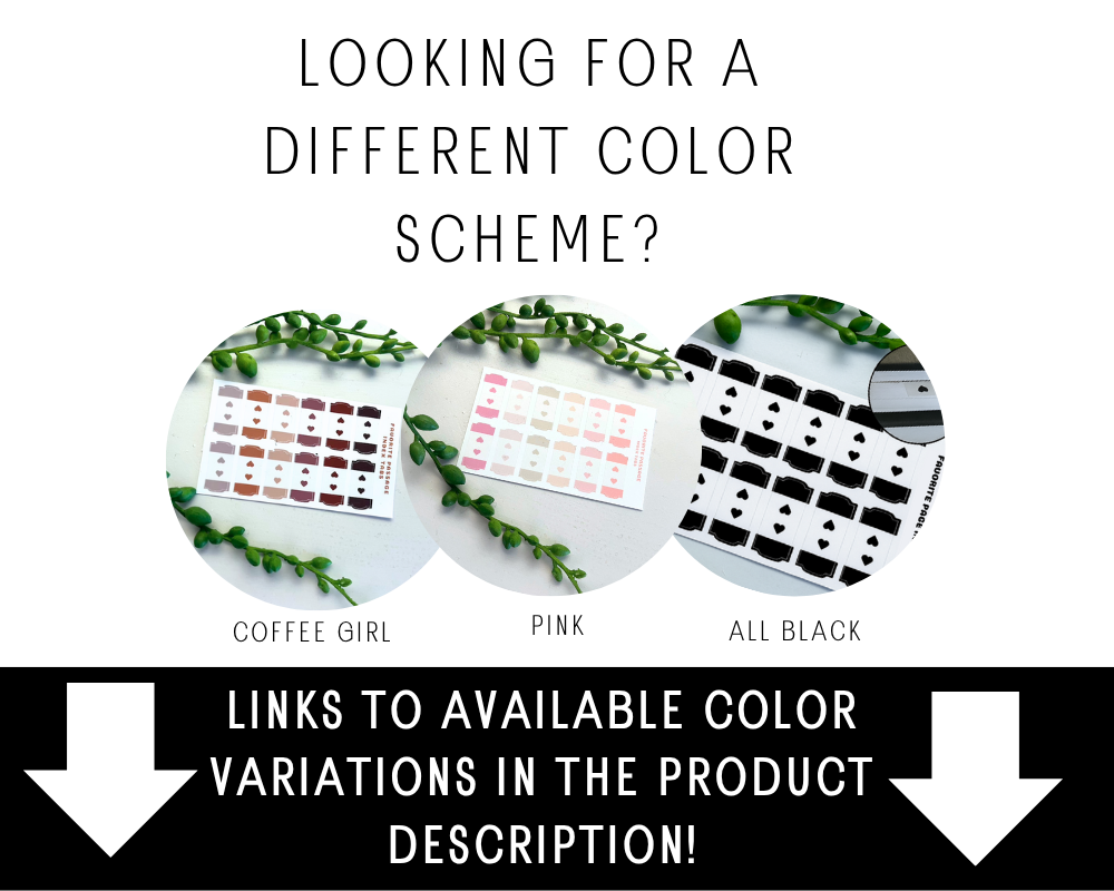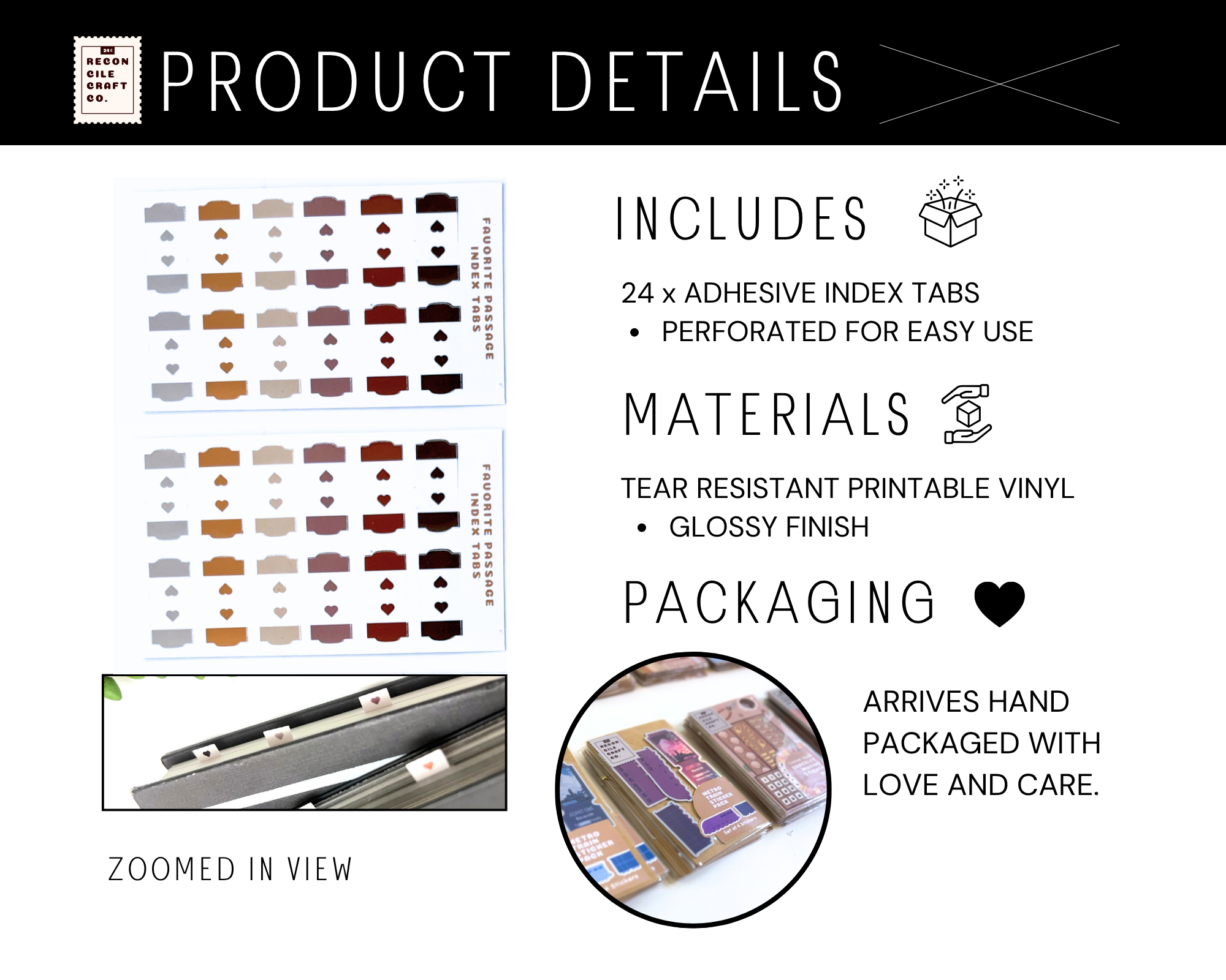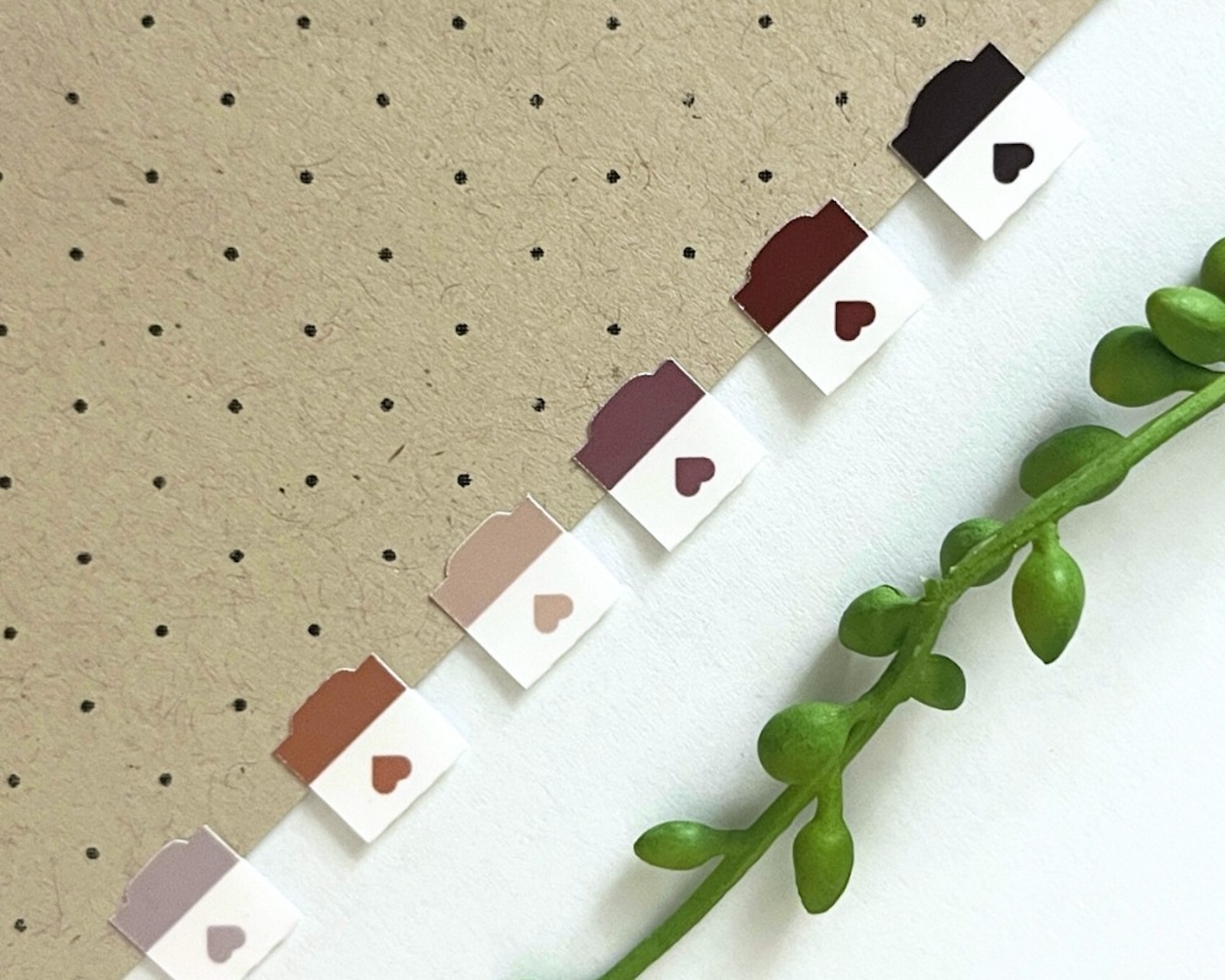 The Favorite Passage Heart Tabs in the Coffee Girl palette include 24 self-adhesive index stickers in warm, earthy tones.