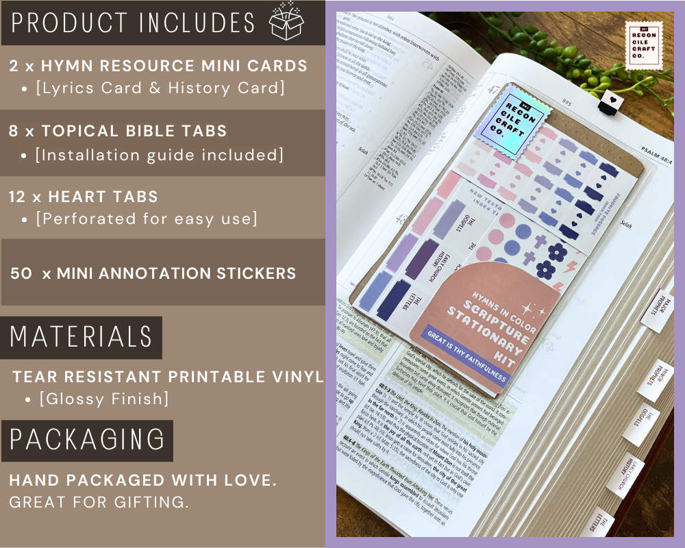 Each colorway in this series is paired with a beloved hymn. Its theme reflected through the palette, the mood, the resources, and the purpose of the tools inside.